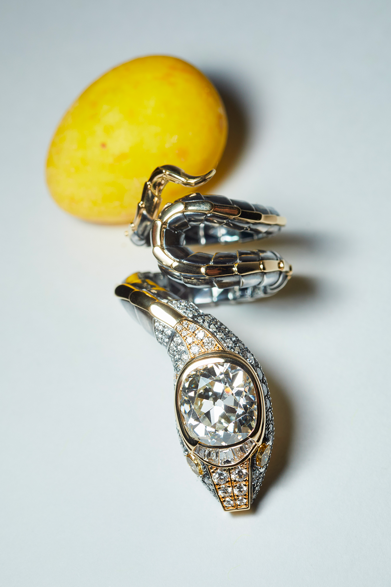 jaunes, sertie d’un diamant de taille ancienne, et au corps enroulé d'