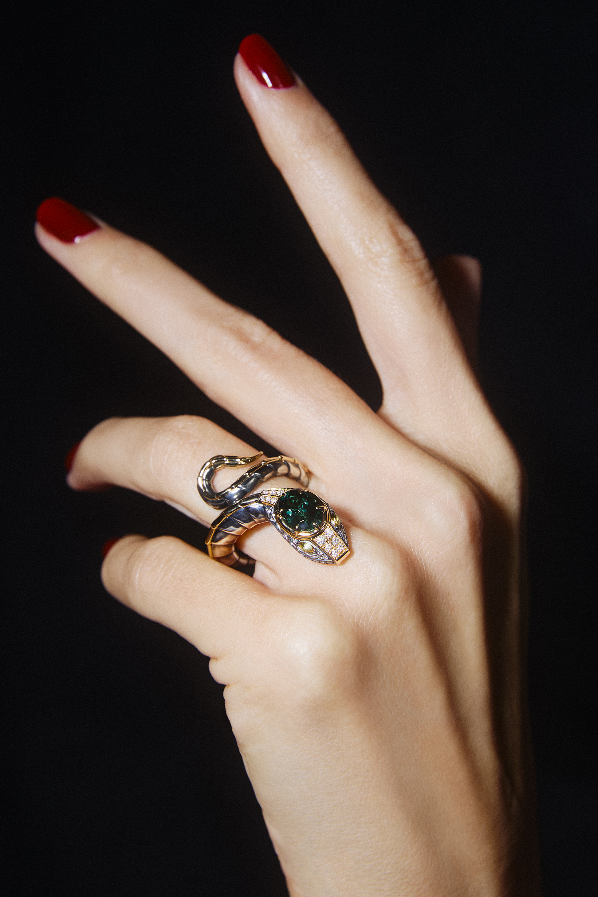 Le corps enroulé d’écailles d’argent patiné à dorsale d’or jaune se termine par une tête qui, pavée de diamants et animée d’yeux de saphirs jaune est sertie en son sommet d’un saphir vert.