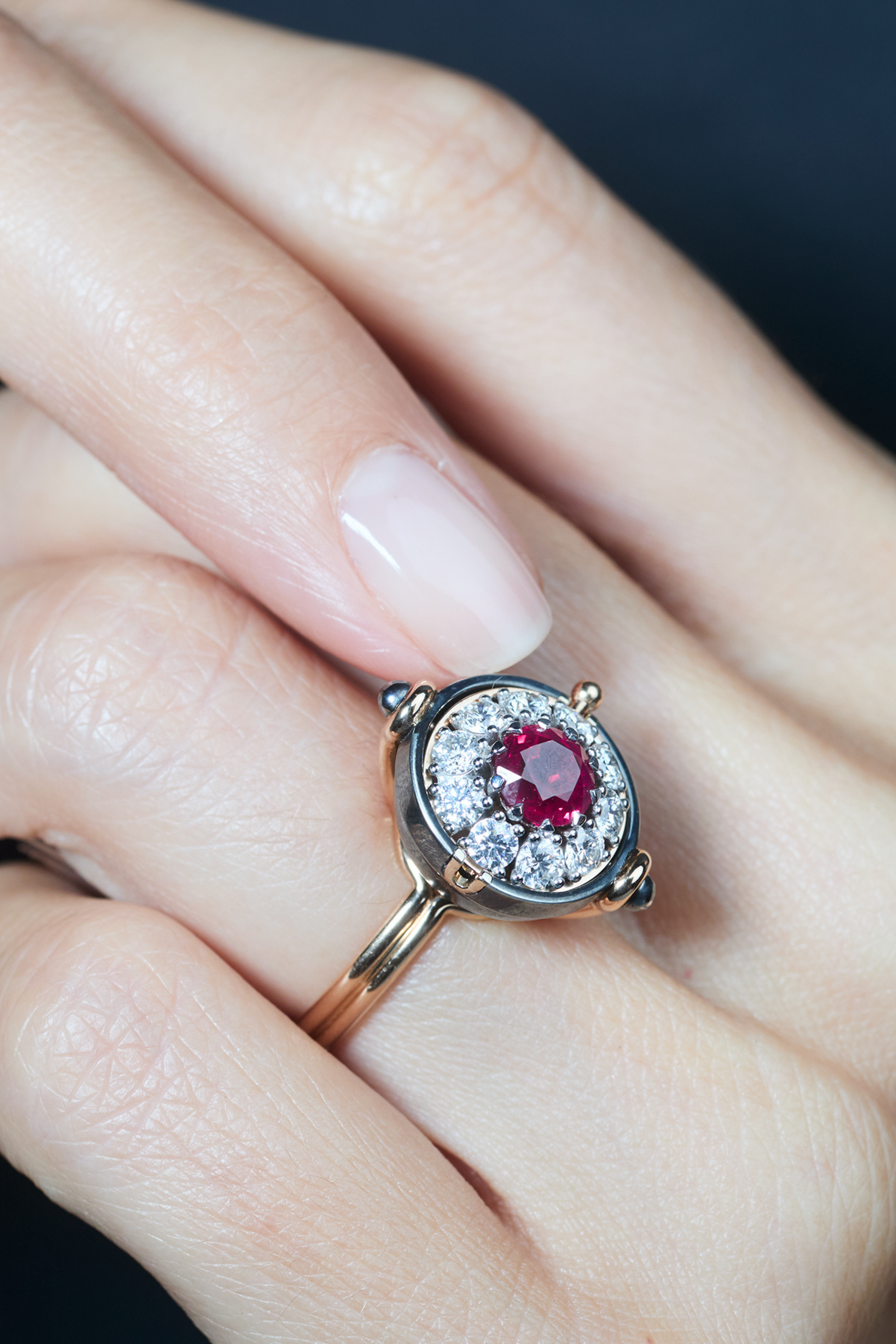 Sphère pivotante sertie d'un diamant étoilé, dévoilant un rubis coussin entouré de diamants.