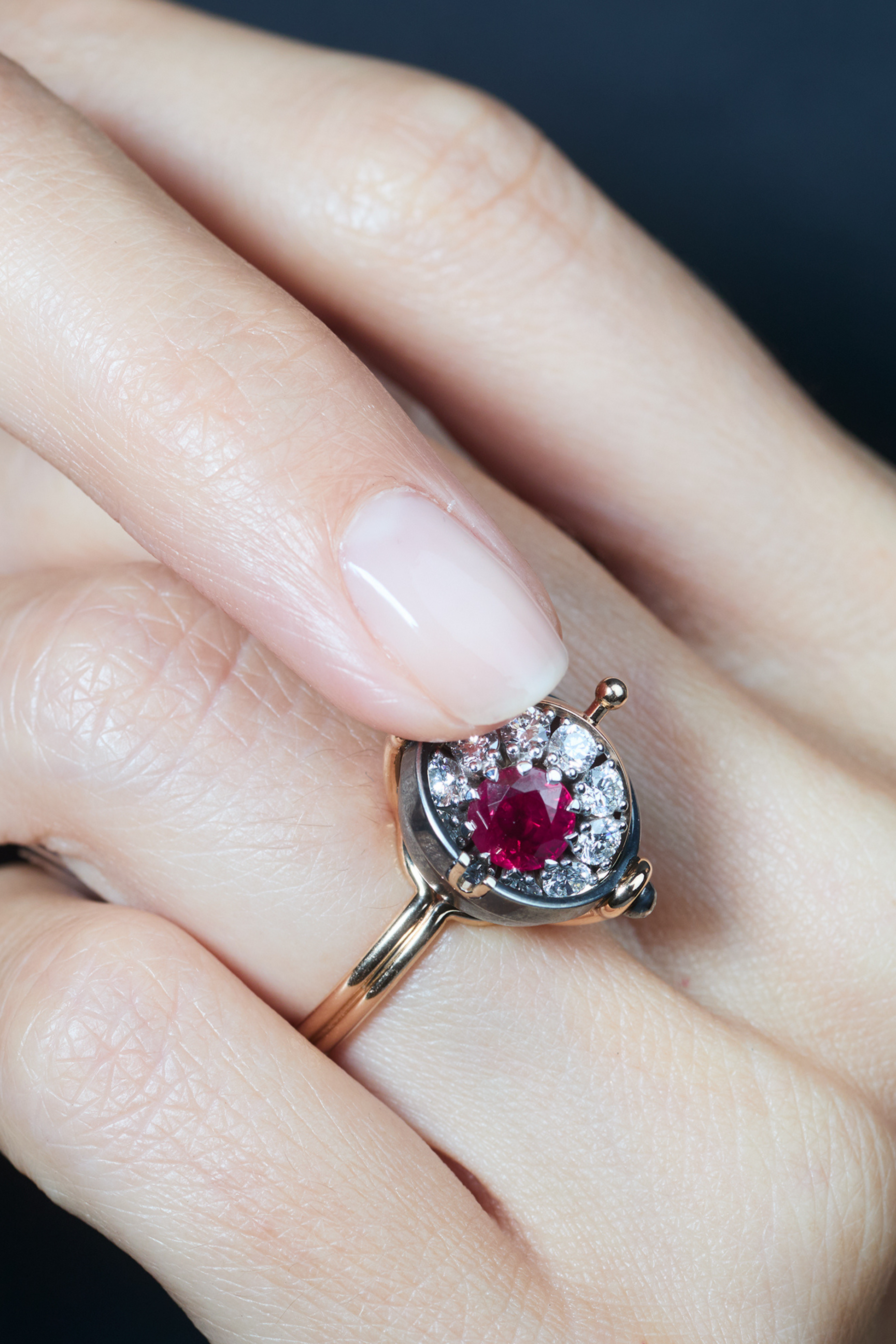 | Matériaux | Rubis Birman : 1.1 cts 11 Diamants : 0,78 cts Or Rose 18k : 9 g Argent Patiné : 2,5 g Fabriqué en France |