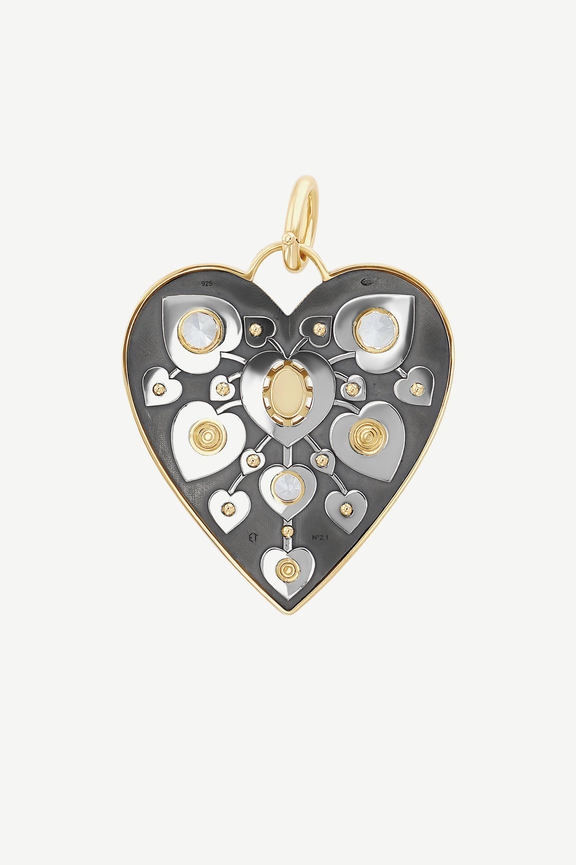 Charm cœur clouté d'une opale entourée de diamants, de saphirs blancs et de perles akoya.